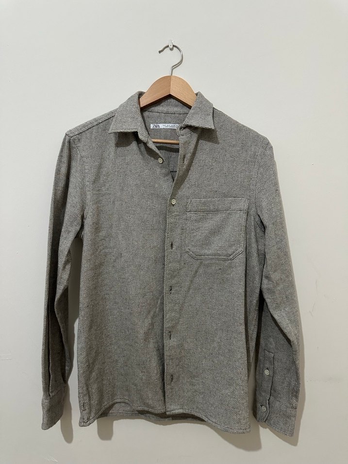 Gri renkte, uzun kollu ve düğmeli erkek gömlek. Normal kesim, keten dokulu kumaştan, minimal ve normcore tarzda günlük kullanıma uygun.