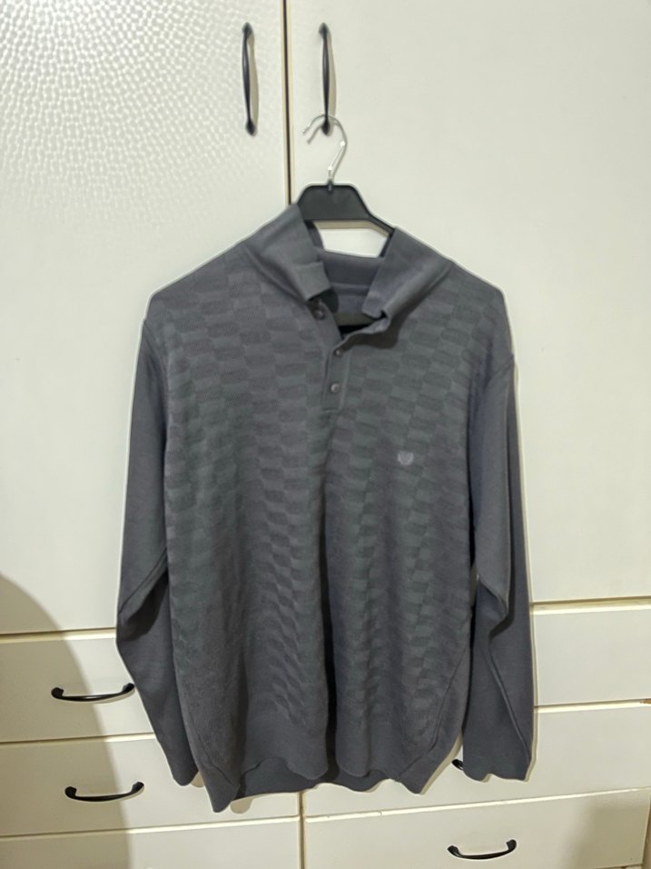Gri renkte, uzun kollu ve düğmeli yakaya sahip erkek kazak. Rahat kesimi ve normal boyuyla günlük kullanıma uygundur. Yumuşak sentetik kumaştan üretilmiştir.