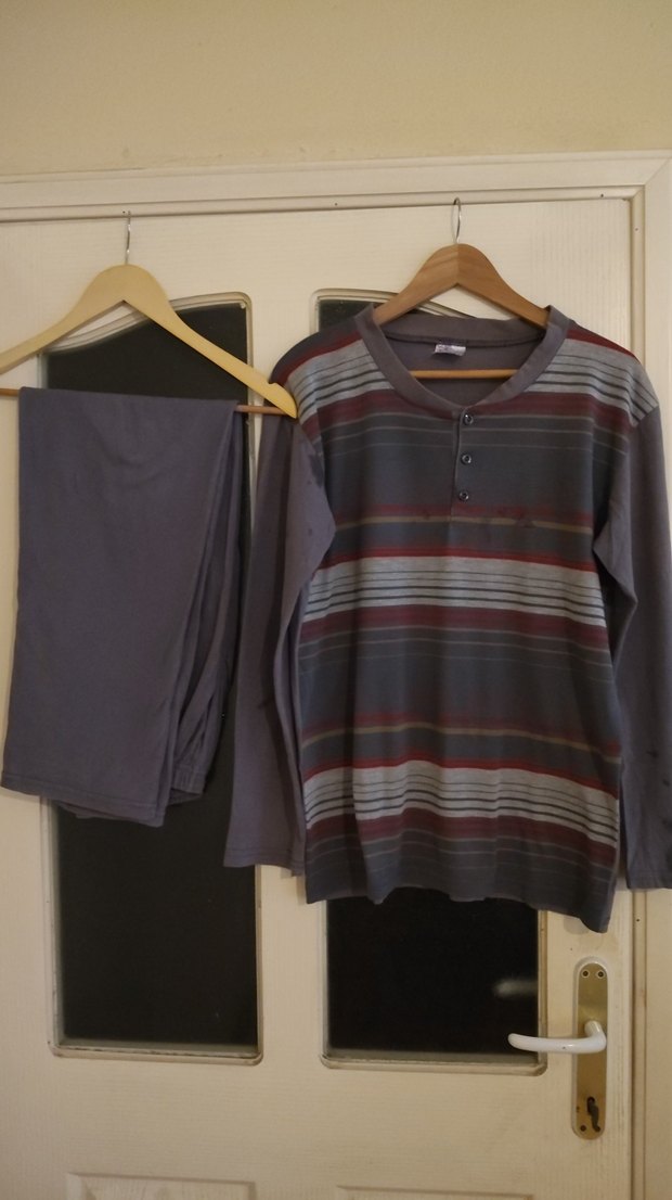 Gri renkte, uzun kollu ve düğmeli yuvarlak yakalı üst ile bol kesim erkek pijama takımı. Bağlama desenli ve normal boy pantolonlu rahat tasarım. iki kol arasi 57 cm uzunluk omuOrtadan etege 70 cm. ust te hafif pamuklanma var. fiyata yanaicak. pamuklu urun.