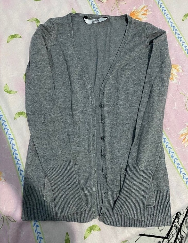 Bu gri, düğmeli, V yaka, uzun kollu S yazıyor ama xs bedene uygun
