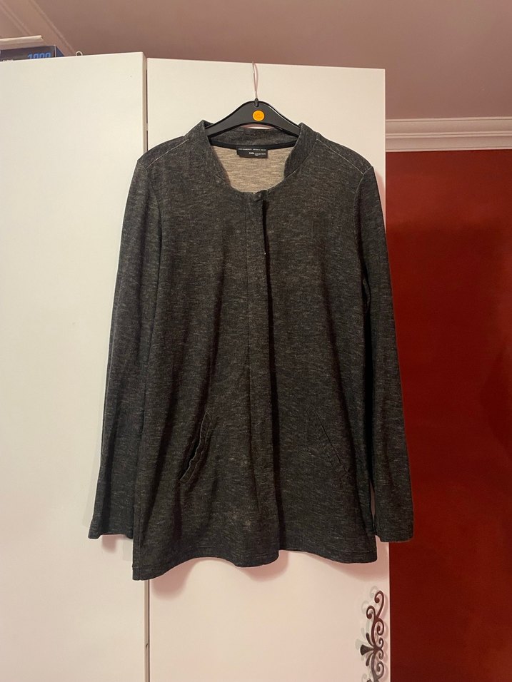 Gri renkli, uzun kollu, düğmeli kadın hırkası. Keten kumaştan, normal midi boyda ve bol kesimdir. Günlük rahatlık için uygundur.
