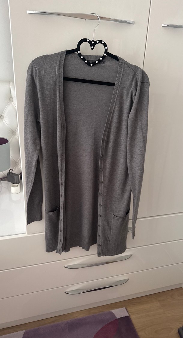 Gri renkte, V yaka ve uzun kollu pamuk kumaştan yapılmış, düğmeli ve cep detaylı bol kesim midi uzunlukta kadın hırka.
