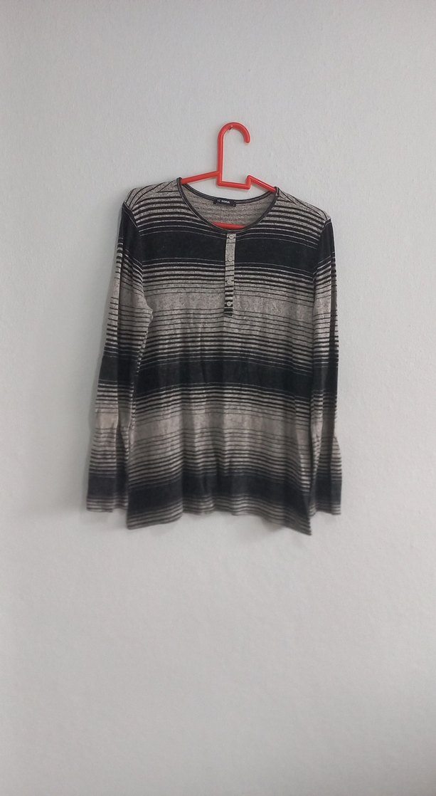 Gri bağlama desenli, uzun kollu, düğmeli ve yuvarlak yakalı, rahat kesim kadın kazak. Günlük ve sokak stiline uygun. iki koltuk arası 50