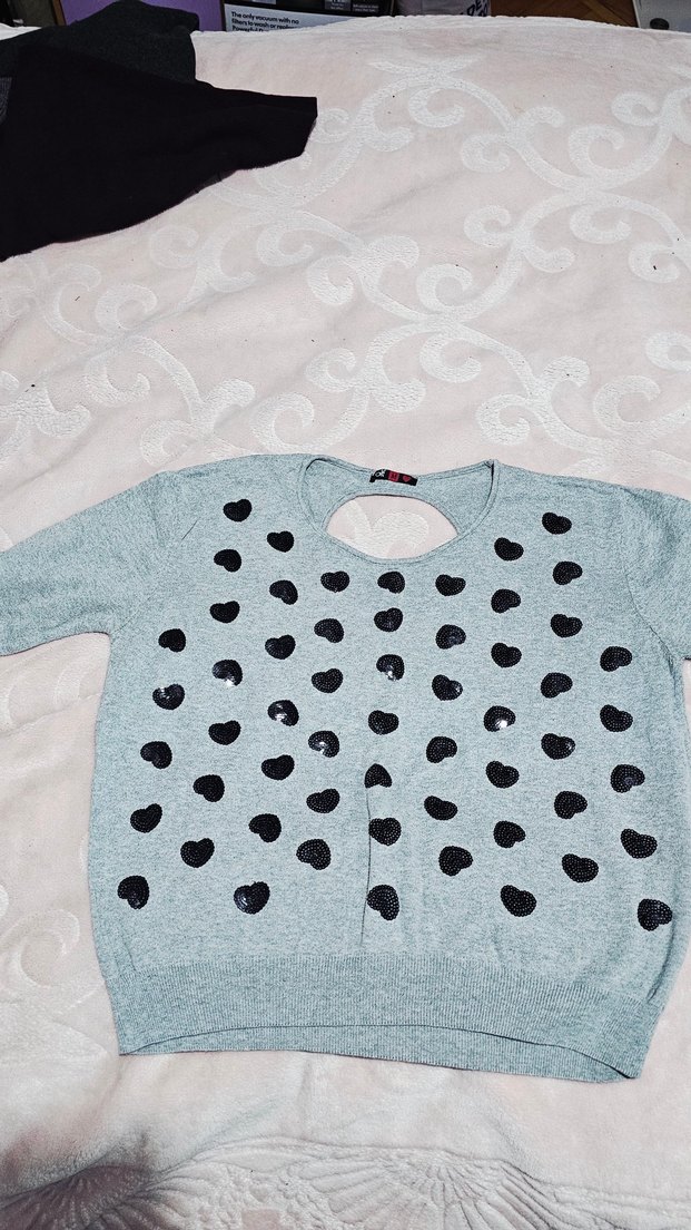 Gri renkte, uzun kollu, düğmeli ve baskılı desenli kadın triko. Salaş kesimi ve bisiklet yaka tasarımı ile günlük kullanıma uygundur.