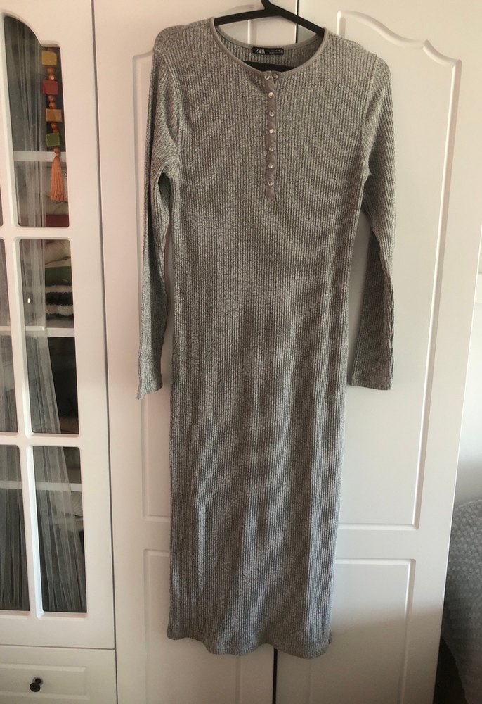 Gri, uzun kollu, düğmeli triko elbise; dar kesim, yuvarlak yaka ve rahat normcore tarzıyla günlük kullanım için uygundur.