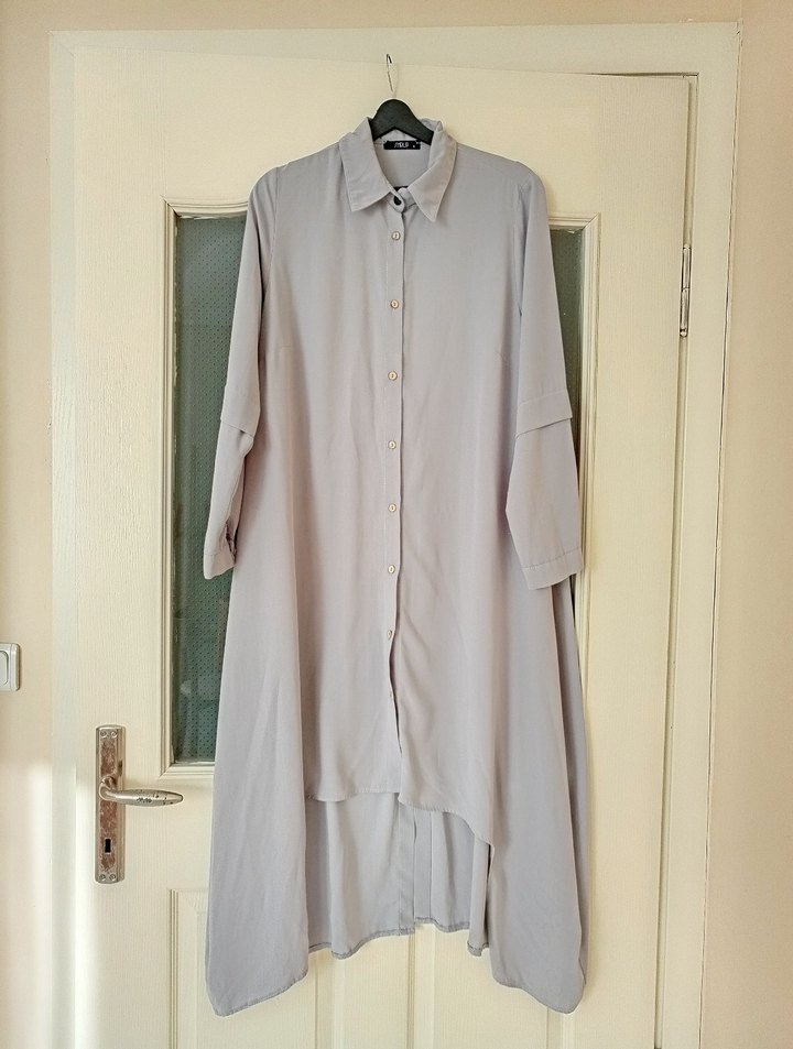 Gei renkte, uzun kollu ve düğmeli, bol kesim ofis stiline uygun uzun tunik. Notlu yaka detayı bulunur.