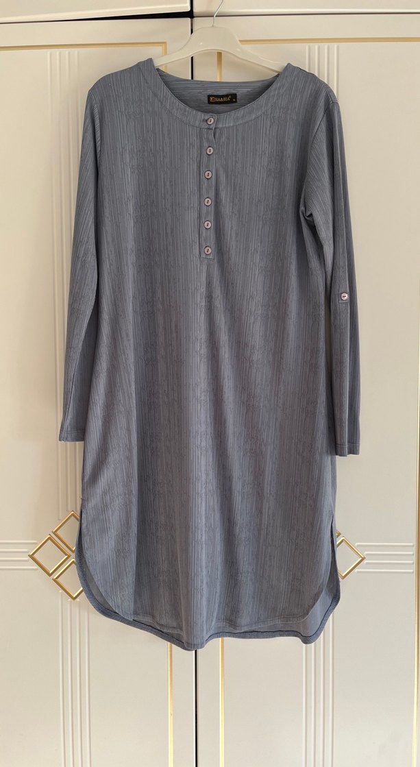 Gri, uzun kollu, düğmeli ve bol kesim tunik. Minimalist tarzda, günlük kullanıma uygun.
