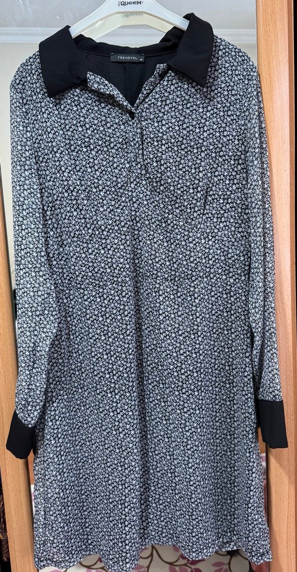 Gri renkte, uzun kollu ve düğmeli manşetli, yakalı, bol kesim elbise . Günlük kullanıma uygun, yumuşak sentetik kumaştan.