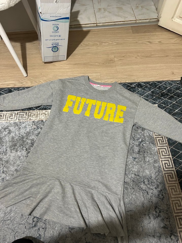 Gri renkli, uzun kollu ve bol kesim sweatshirtü. Örme dokusu ve önünde sarı 'FUTURE' baskısı bulunur. Rahat ve trend bir parça.