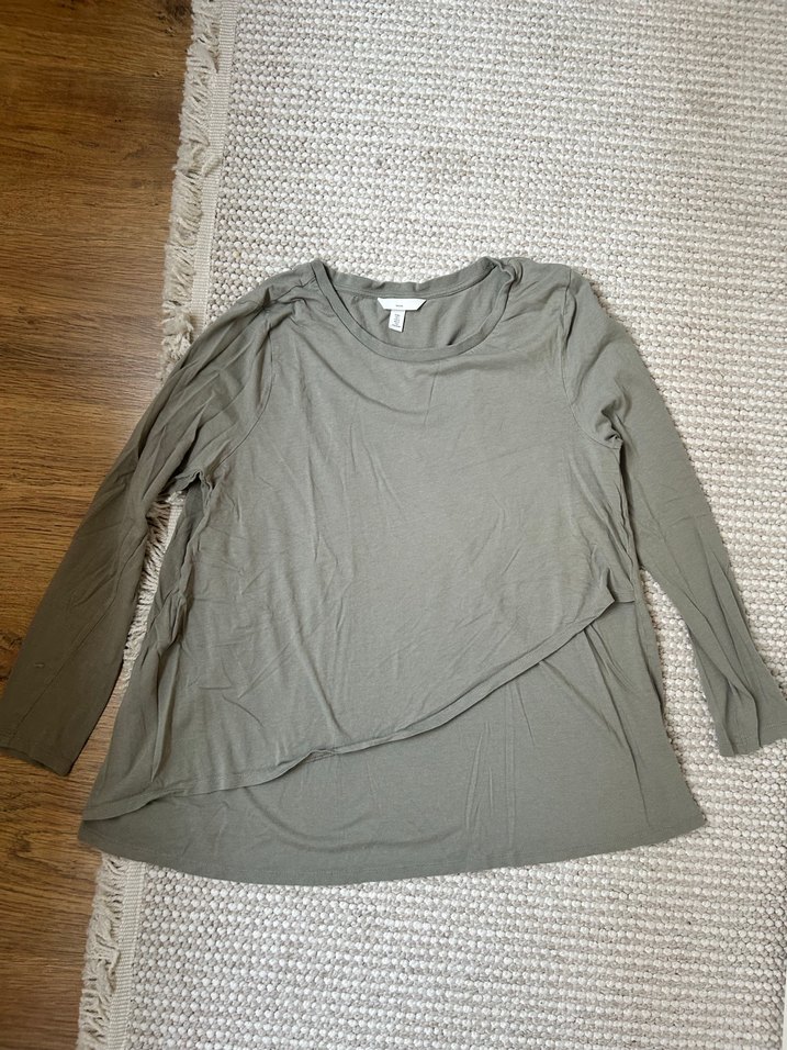 Gri renk, uzun kollu, yuvarlak yakalı ve bol kesim emzirme tişörtü. Yumuşak kumaştan, günlük kullanıma uygun sade ve rahat bir model.