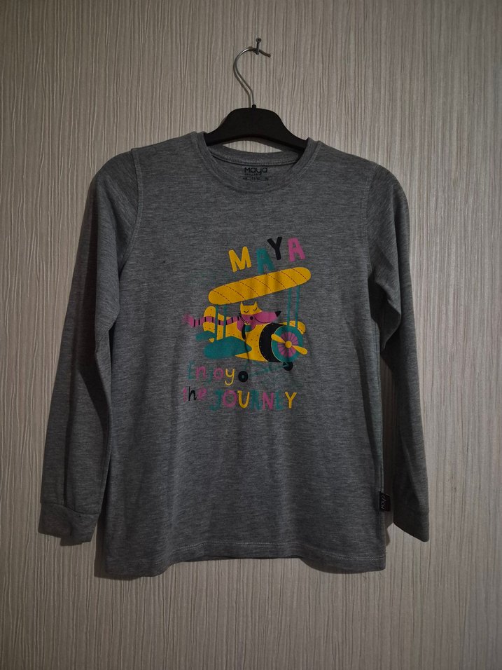 Gri renkli, uzun kollu erkek çocuk sweatshirtü, örme dokusu ve renkli baskılı uçak deseniyle dikkat çeker. Rahat kesim ve yuvarlak yaka, yumuşak ve sıcak kumaştan üretilmiştir. ✈️