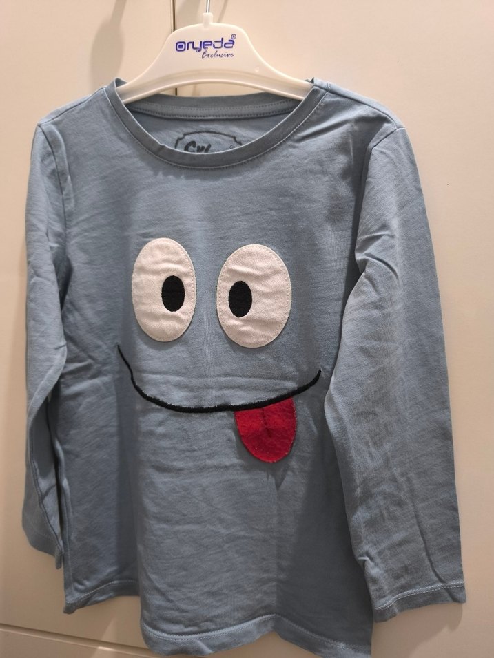 Gri renkte, uzun kollu ve yuvarlak yakalı erkek çocuk tişörtü. Bol kesim, yumuşak kumaş ve düğmeli, eğlenceli baskılı yüz deseni içerir.