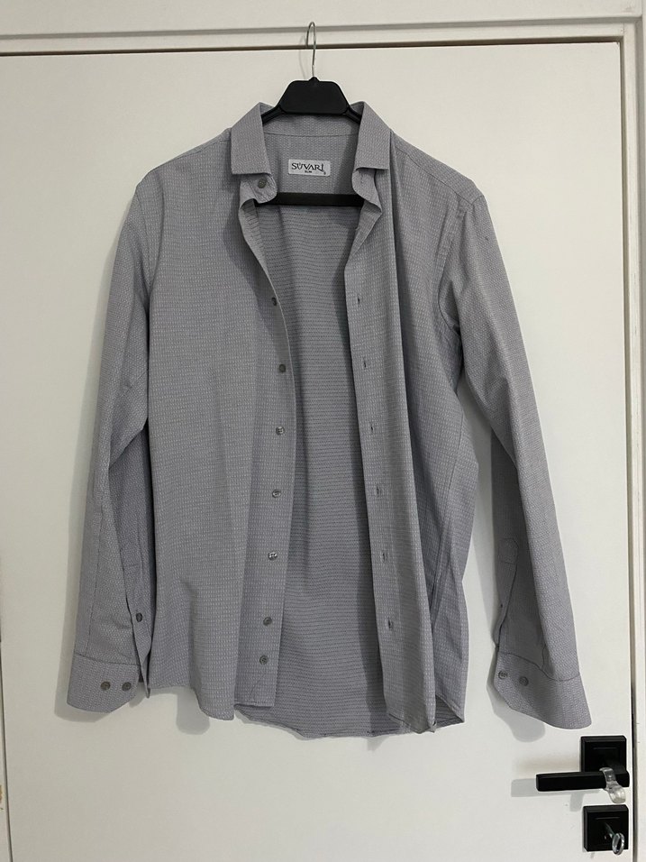 Gri renkli, uzun kollu erkek gömlek, çıtçıt düğmeli ve notched yakalıdır. Normal boyda ve rahat kesim olup, sentetik kumaştan yapılmıştır.