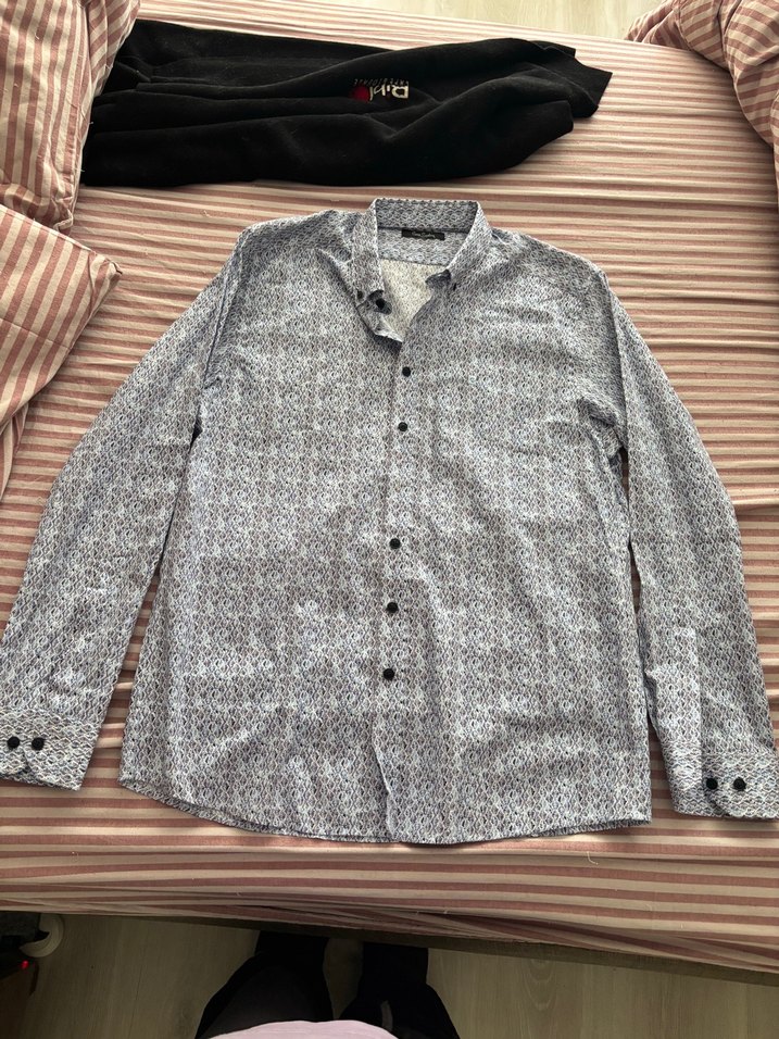 Gri renkte, uzun kollu, düğmeli, regular fit erkek gömleği. Normal boyda, sentetik kumaştan, günlük rahat kullanım için uygundur.