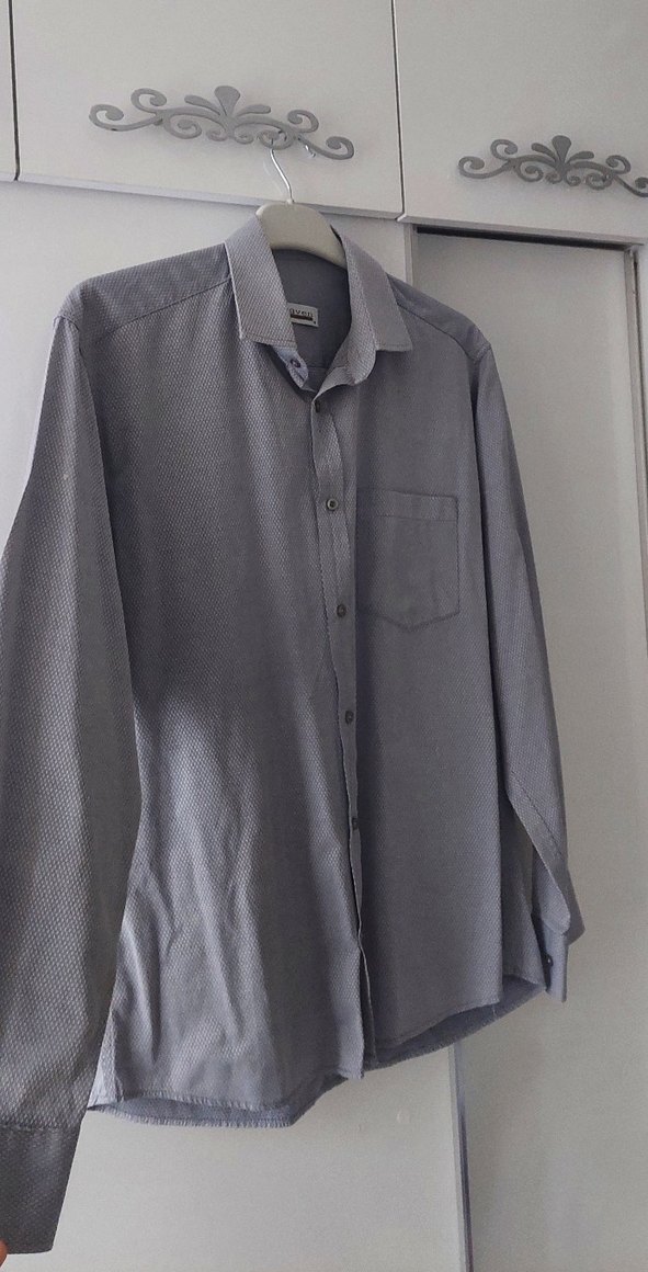 Gri renkte, uzun kollu ve düğmeli erkek gömleği. gömleğin kusurları: sağ kolunda lekeler mevcut (2. ve 3. resimde yer alıyor) pazarlık payı yoktur.