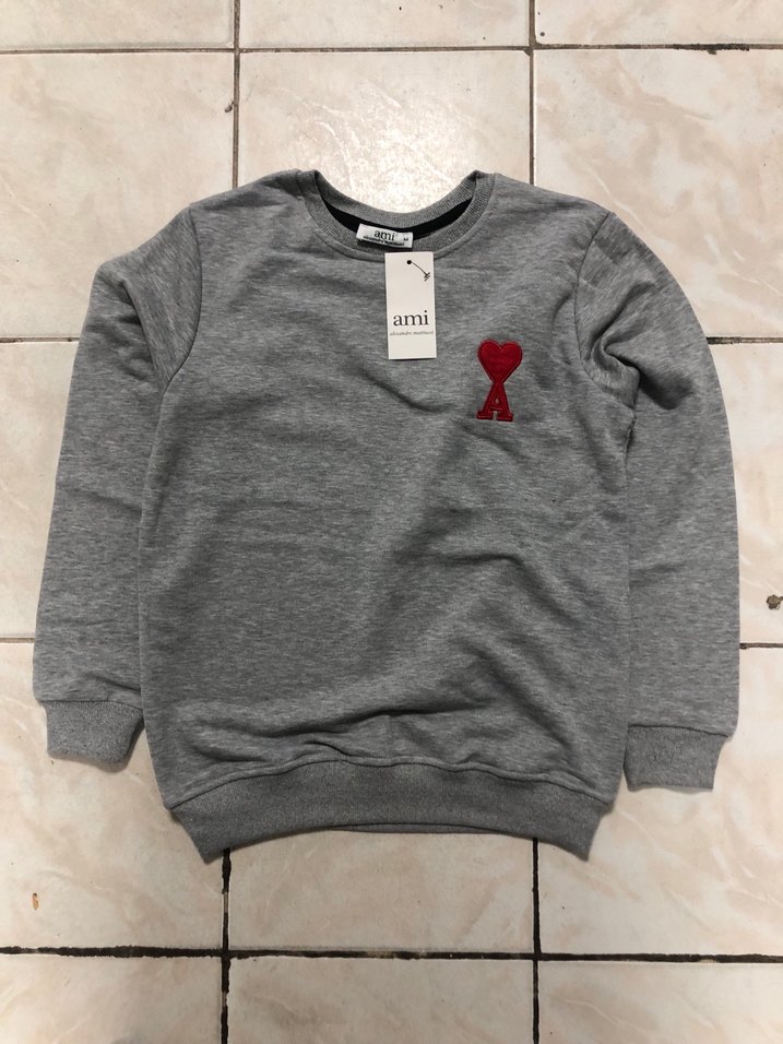 Gri renkli, yumuşak yün kumaştan, uzun kollu ve bisiklet yakalı erkek sweatshirt. Rahat kesim ve göğüste küçük kırmızı baskılı logo bulunur.