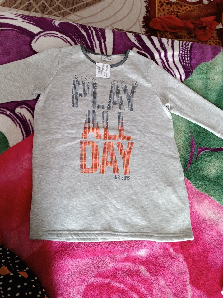 Gri renkli, uzun kollu ve bol kesim erkek sweatshirt. Üzerinde "PLAY ALL DAY" baskısı bulunan, sokak stili için uygun bir model. hediye geldi hiç kullanılmadı