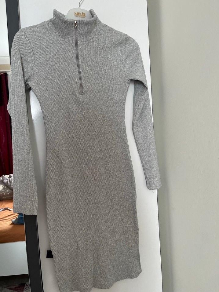 Gri renkte, yüksek yakalı ve uzun kollu, fermuarlı, vücuda oturan midi elbise. Rahat sentetik kumaştan, gündelik sokak stili için uygundur.