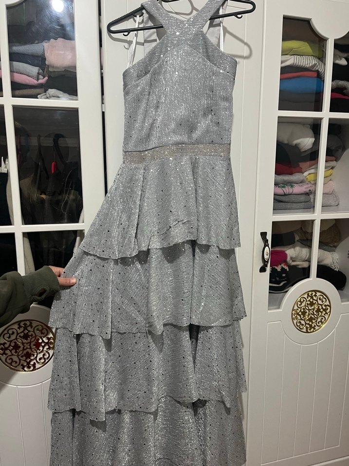 Kolsuz, yüksek yakalı, kat kat fırfır detaylı, uzun ve vücuda oturan gri abiye elbise, şık parti kombinleri için uygundur. ✨