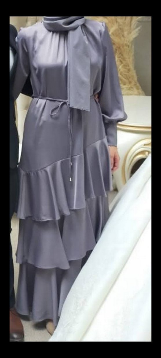 Gri, uzun ve bol kesim elbise, ipeksi kumaş ve kat kat fırfır detaylarıyla. Yüksek yakalı ve askılı kollu, ofis için uygun modest ve çağdaş tarzda.
