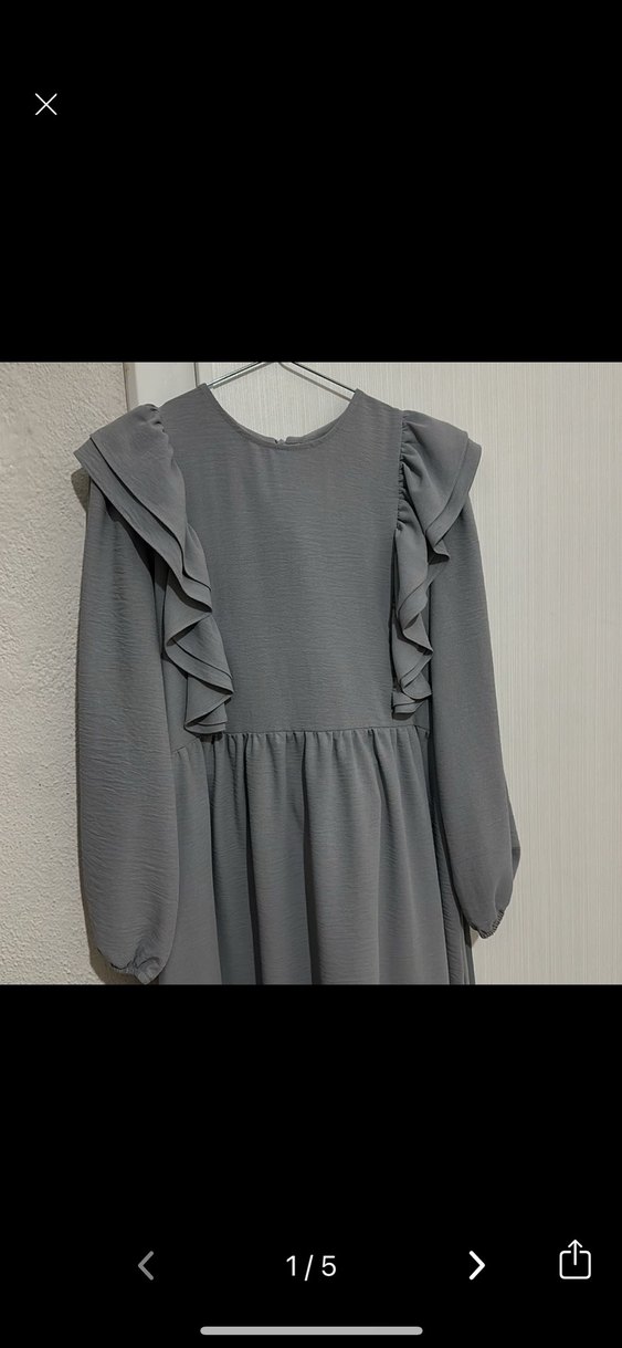 Gri Uzun Kollu Fırfırlı Keten Elbise