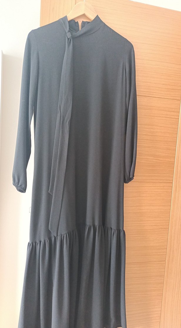 Yüksek yakalı, uzun kollu gri elbise, salaş kesim ve etek kısmında fırfır detayına sahiptir. Pürüzsüz sentetik kumaştan, sade ve muhafazakar tarz için uygun.