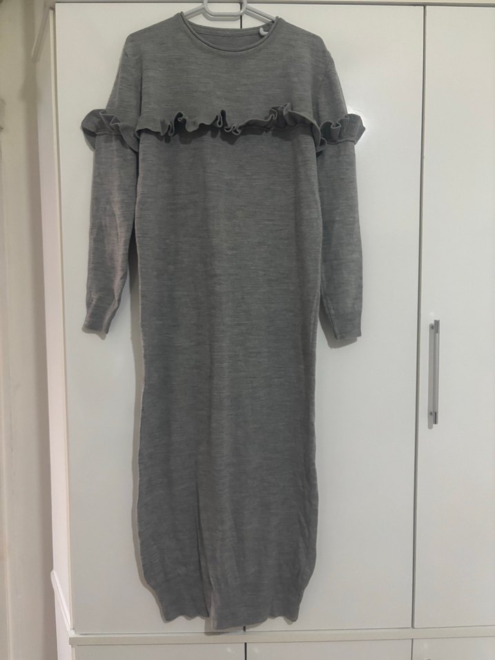 Gri renkte, uzun kollu ve yuvarlak yakalı triko elbise. Göğüs kısmında fırfır detayı bulunur, bol kesim ve uzun boyuyla rahat ve şık bir görünüm sunar.