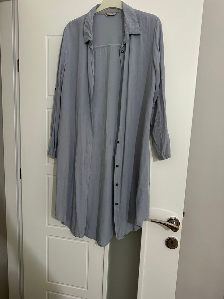Gri renkte, uzun kesim, kumaştan yapılmış, yakalı ve düğmeli, bol kesim gömlek. Minimalist ve normcore tarzıyla günlük kullanıma uygundur.