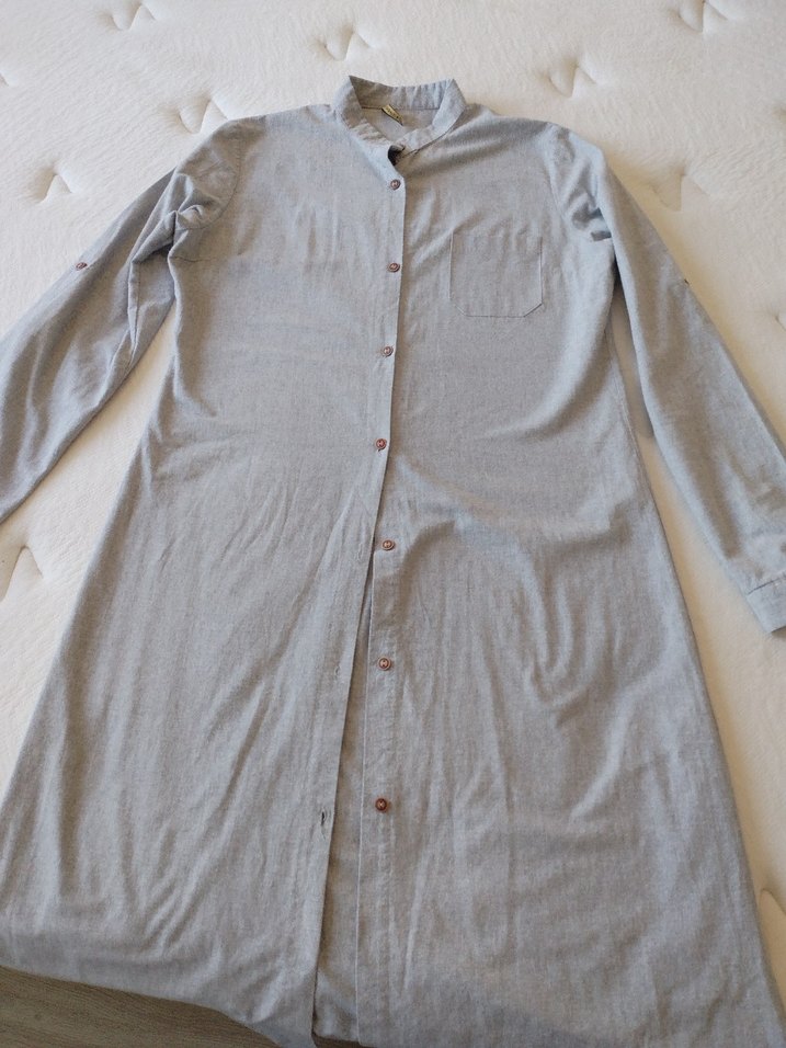 Gri renkli, uzun kollu düğmeli ve yakalı uzun gömlek i. Rahat kesimiyle günlük kullanıma uygundur.