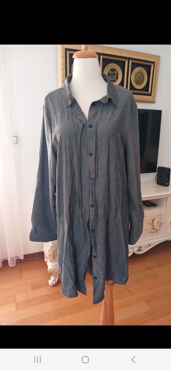 Bol kesim kadın gömlek. İki kol arası 56 Bel 58. Basen 60 Uzunluk 92 cm dir Koyu gri rengindedir. Temiz sorunsuz