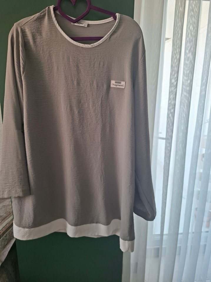 Gri renkli hamile tişörtü, uzun kollu ve bisiklet yaka. Yumuşak keten kumaştan, bol ve midi boyda, sade ve şık tasarıma sahip.