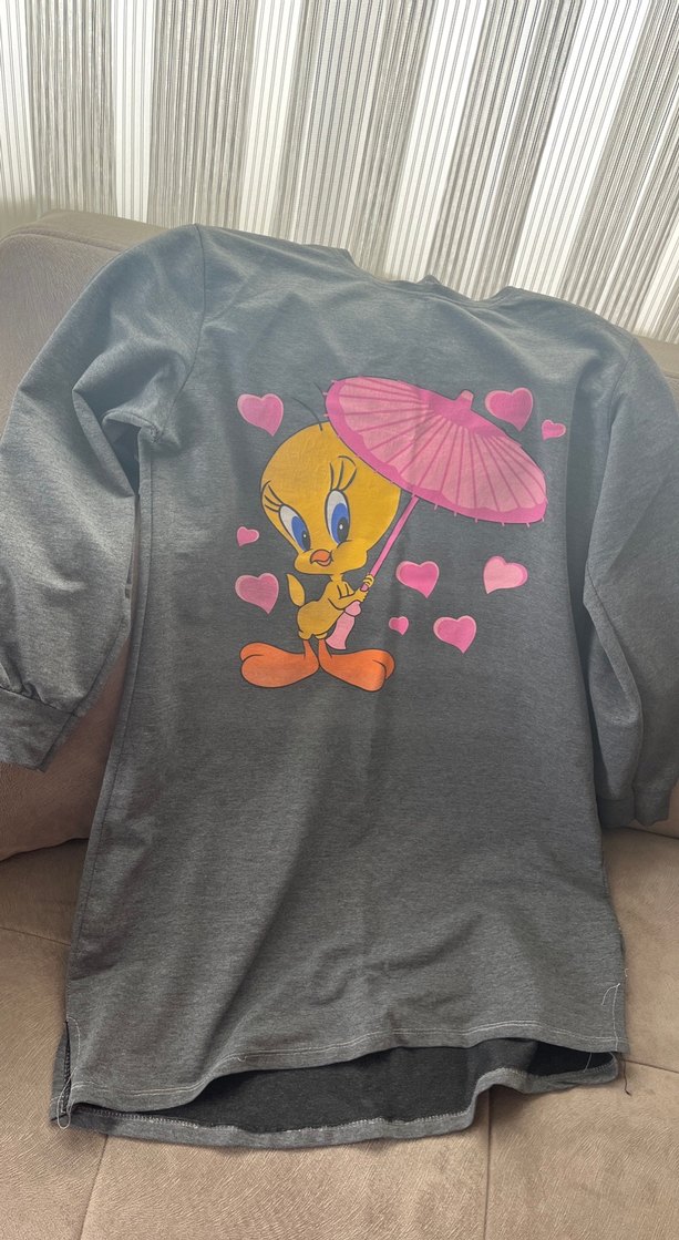 Gri renkli, uzun kollu, yuvarlak yaka, bol kesim hamile tişörtü. Tweety baskısı, kalpler ve pembe şemsiye detaylı. Düğmeli ve rahat, trend sokak stili için uygun.