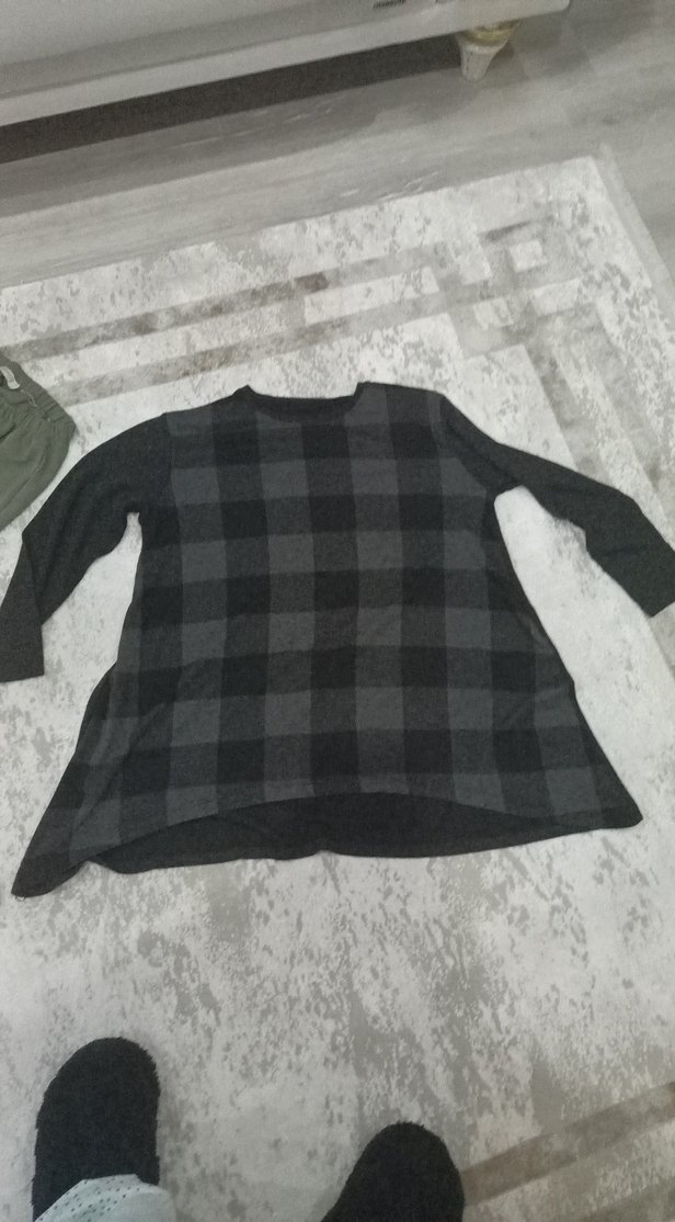 Gri renkte, uzun kollu ve yuvarlak yakalı hamile tunik. Rahat kalıp ve midi boyda, yumuşak ve sıcak kumaştan. Düğme detaylı ve hafif kare desenli.