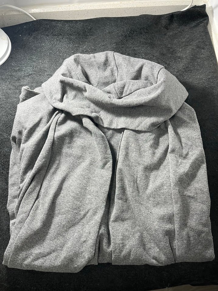 Gri renkte, yumuşak keten kumaştan yapılmış, bol kesim ve drapeli boğazlı uzun kollu kaban. Günlük kullanıma uygun sade ve rahat bir modeldir.