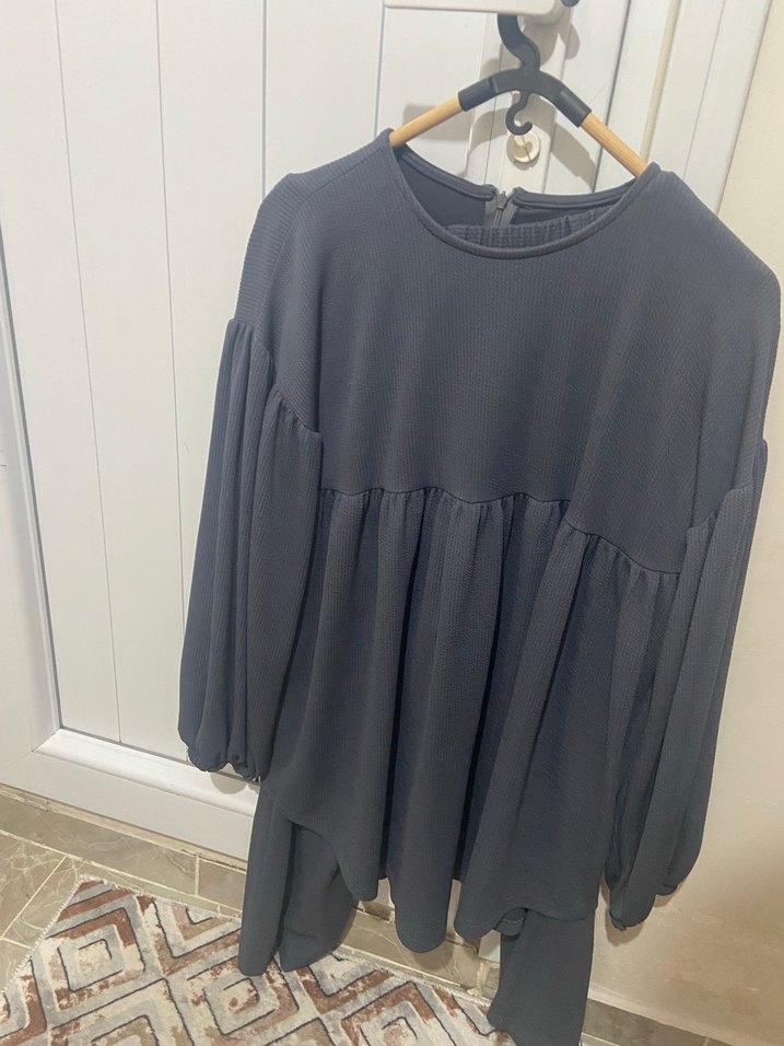 Gri renkte, rahat kesim, uzun kollu ve yuvarlak yakalı ikili takım