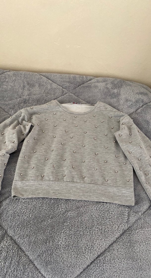 Gri renkli, uzun kollu ve yuvarlak yakalı bluz.Bol kesim ve kısa boyda, küçük inci detaylarıyla süslenmiştir. Günlük kullanıma uygundur. Ürün tertemiz ve sorunsuzdur.