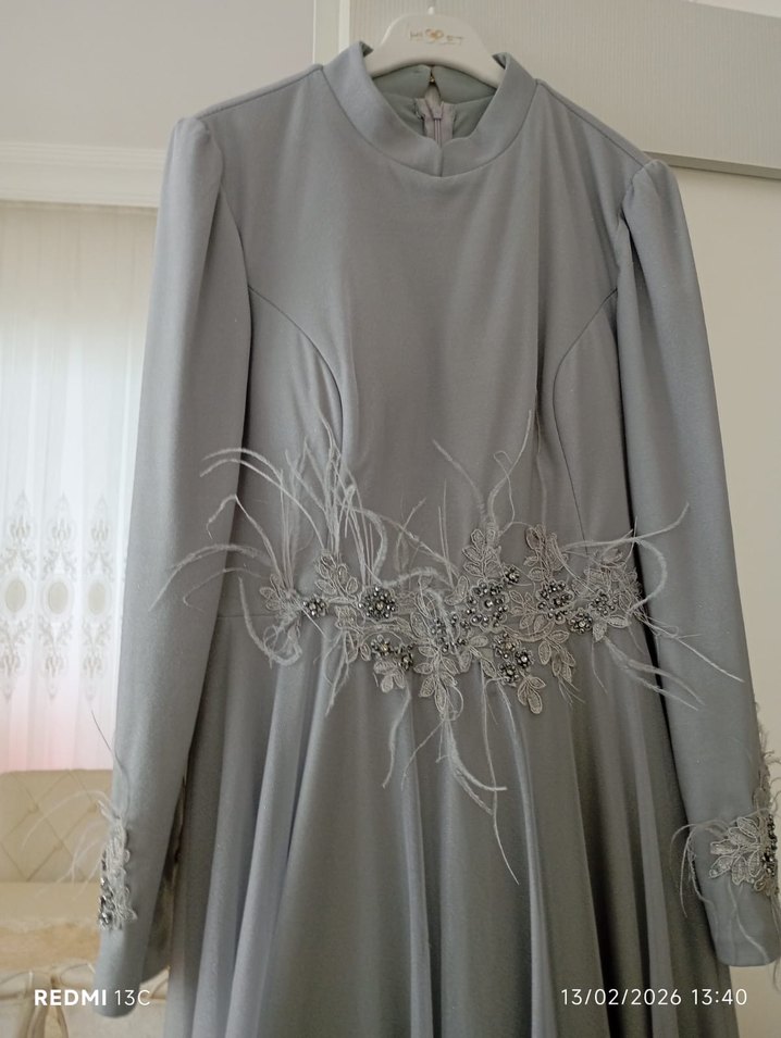 Gri renkte, uzun kollu ve dar kesim abiye elbise. Bel ve kollarda işlemeli detaylar ve drapeli tasarım bulunur. Düğün gibi özel anlar için uygun.