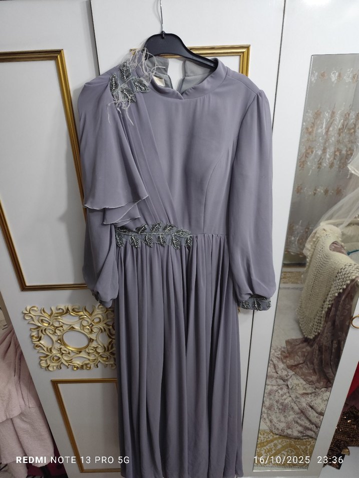 Gri renkli, yüksek yakalı ve uzun kollu işlemeli detaylara sahip, salaş ve drapeli uzun abiye elbise. Düğün ve vintage temalar için uygundur.
