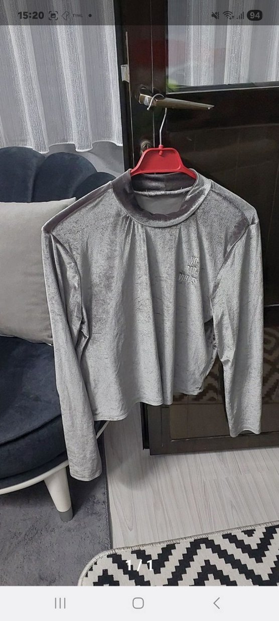 Gri renkli, uzun kollu, yuvarlak yaka ve kadife kadın sweatshirtü. Midi boyda, yumuşak ve sıcak kumaştan, günlük rahat kullanım için uygun.
