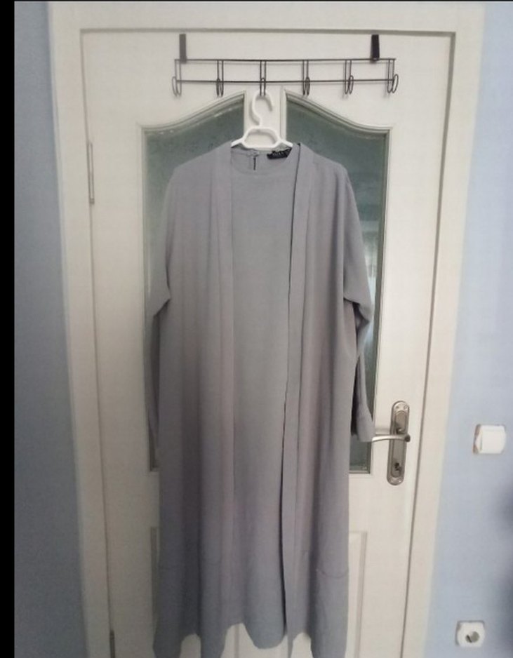 Gri renkte, uzun kollu ve regular fit kesime sahip sade ve minimalist kadın abiye elbise.