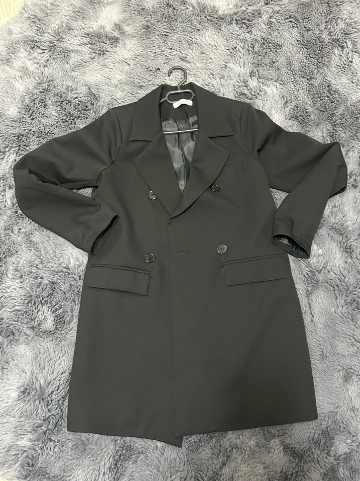 Gri renkli, düğmeli detaylı, uzun kollu kadın blazer ceket. Normal kesim ve uzun boyda, ofis kullanımı için uygun, sentetik kumaştan üretilmiştir.