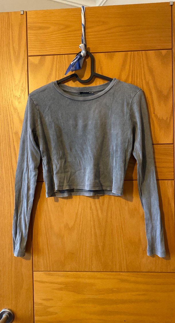 Gri renkte, fitilli kumaştan uzun kollu, bisiklet yaka ve crop boyda, sade ve sportif kadın kazak. Günlük kullanıma uygundur.