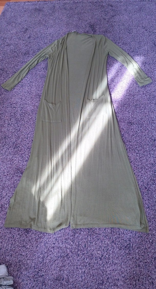 Uzun kollu, bol kesim gri kadın sabahlığı, rahat ve bohem tarzda. Önünde iki cep bulunur, yumuşak dokuludur.
