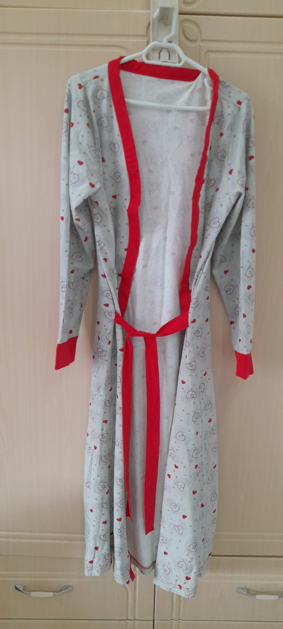 Gri renkte, uzun kollu ve bol kesim kadın bornoz. Üzerinde kalp desenleri ve kırmızı şerit detayları bulunur, belden bağlamalıdır. ❤️