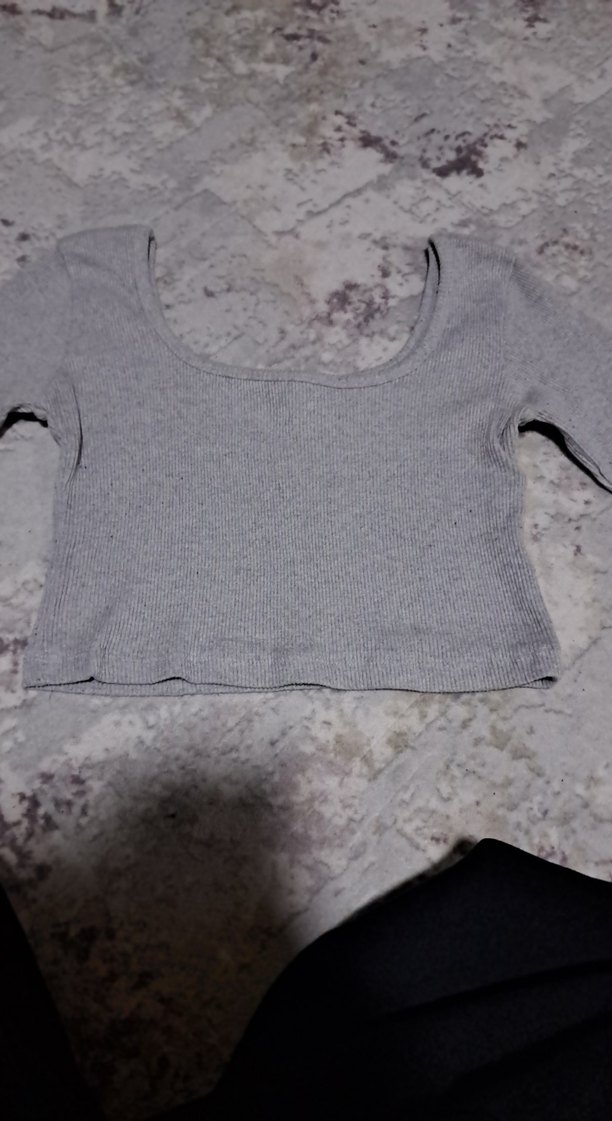 Gri renk, uzun kollu ve tek renk, rahat keten kumaştan yapılmış, salaş kesimli crop top. Günlük sokak tarzı için uygun, şık ve sade tasarıma sahip.