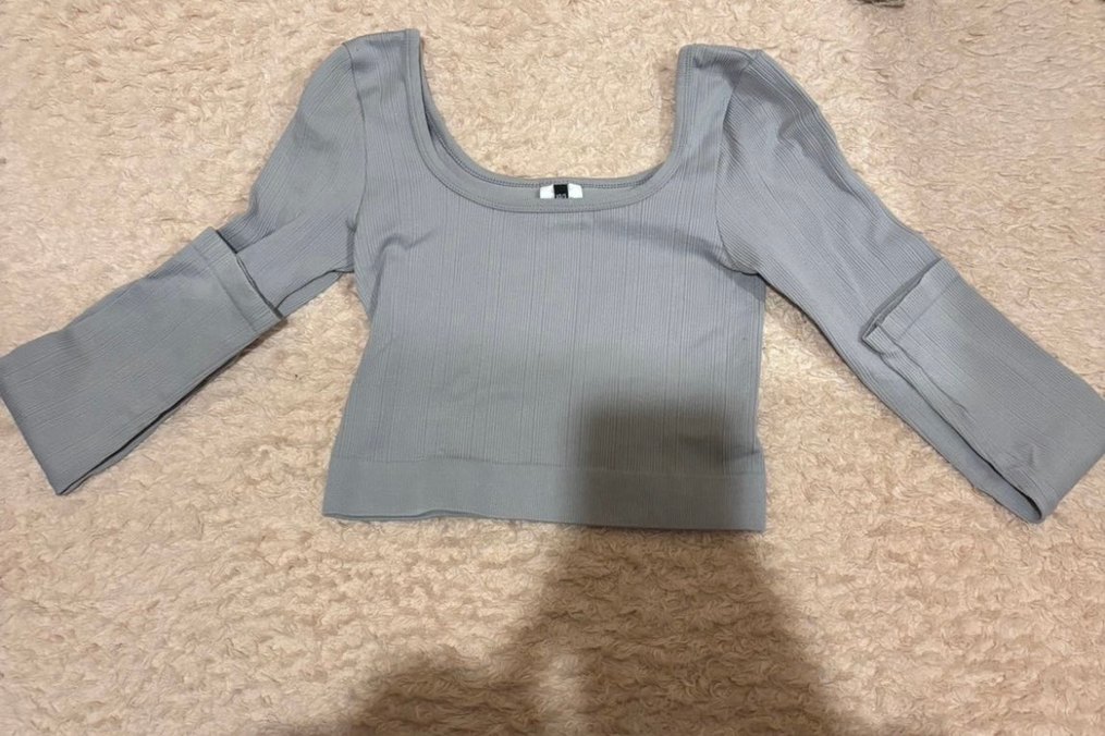 Gri renkli, uzun kollu ve tek renk crop top, tekne yaka ve vücuda oturan kesime sahiptir. Minimalist tarzıyla günlük kullanıma uygundur.