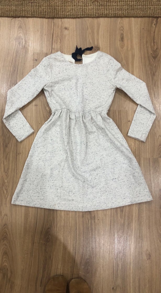 Gri renkli Kadın elbisesi, uzun kollu ve yuvarlak yakalıdır. Rahat kalıbı ve yumuşak sentetik kumaşıyla sade ve şık bir görünüm sunar.
