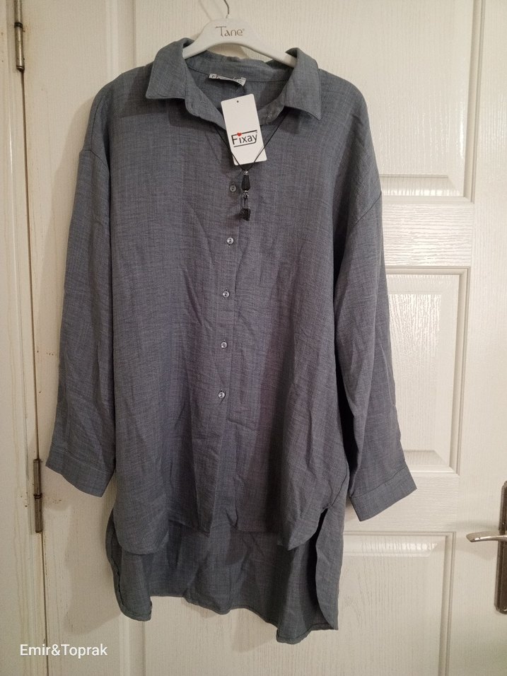 Gevşek kesim, uzun kollu gri gömlek. Yumuşak kumaştan, yakalı ve düğmeli, günlük kullanıma uygun.