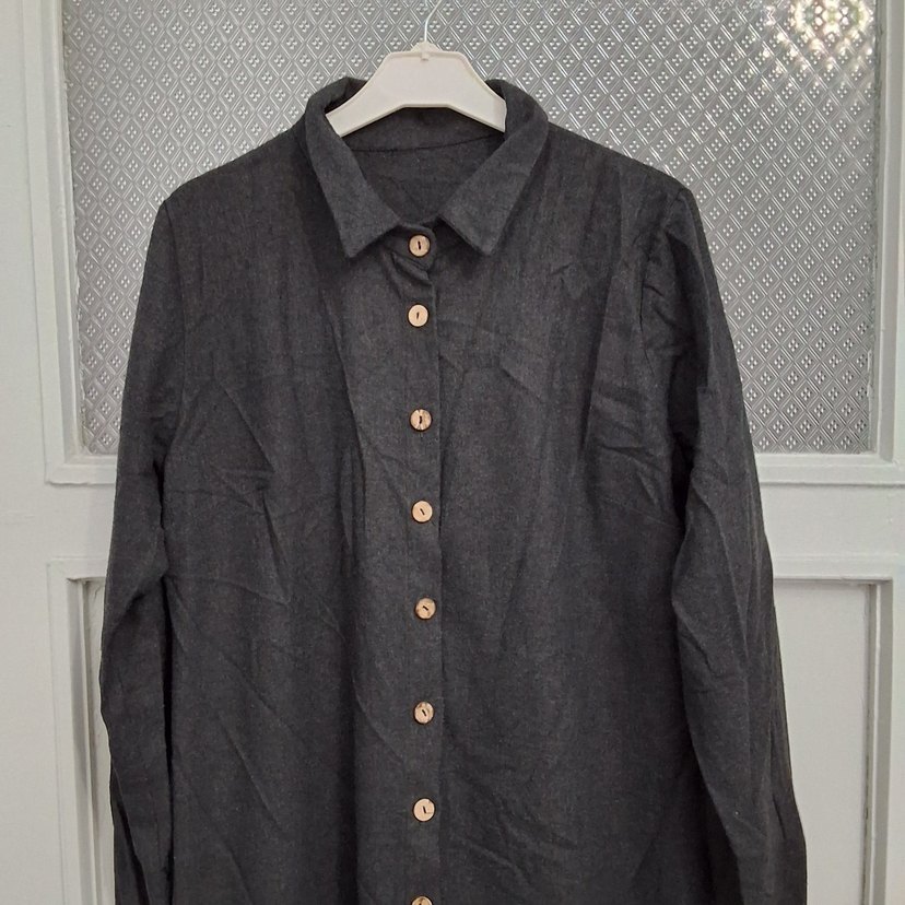 Gri uzun kollu, yakası kesik detaylı, düğmeli önlü kadın gömleği. Normal kesim ve sade, günlük kullanıma uygun tarzda.