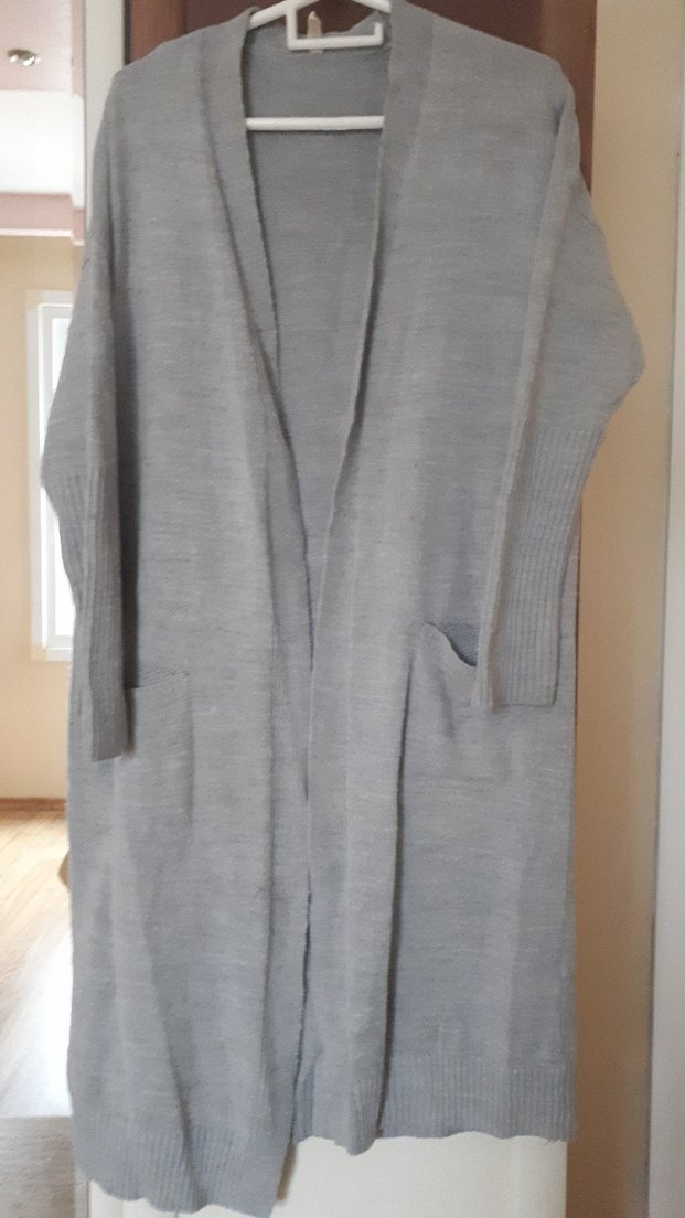 Gri renkte, uzun kollu ve notalı yaka detaylı, örme kumaştan yapılmış bol kesim uzun hırka. Rahat ve günlük kullanıma uygun.
